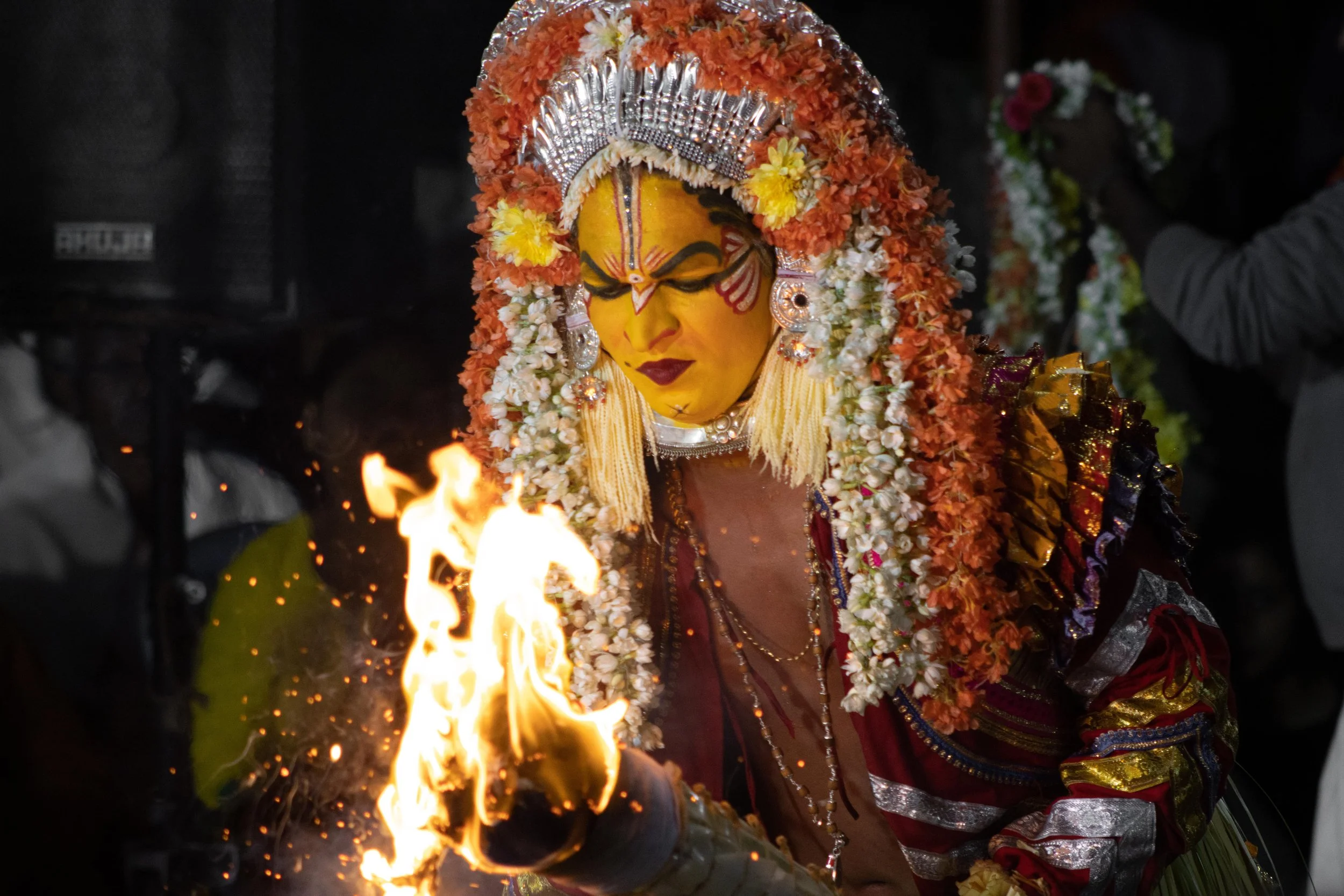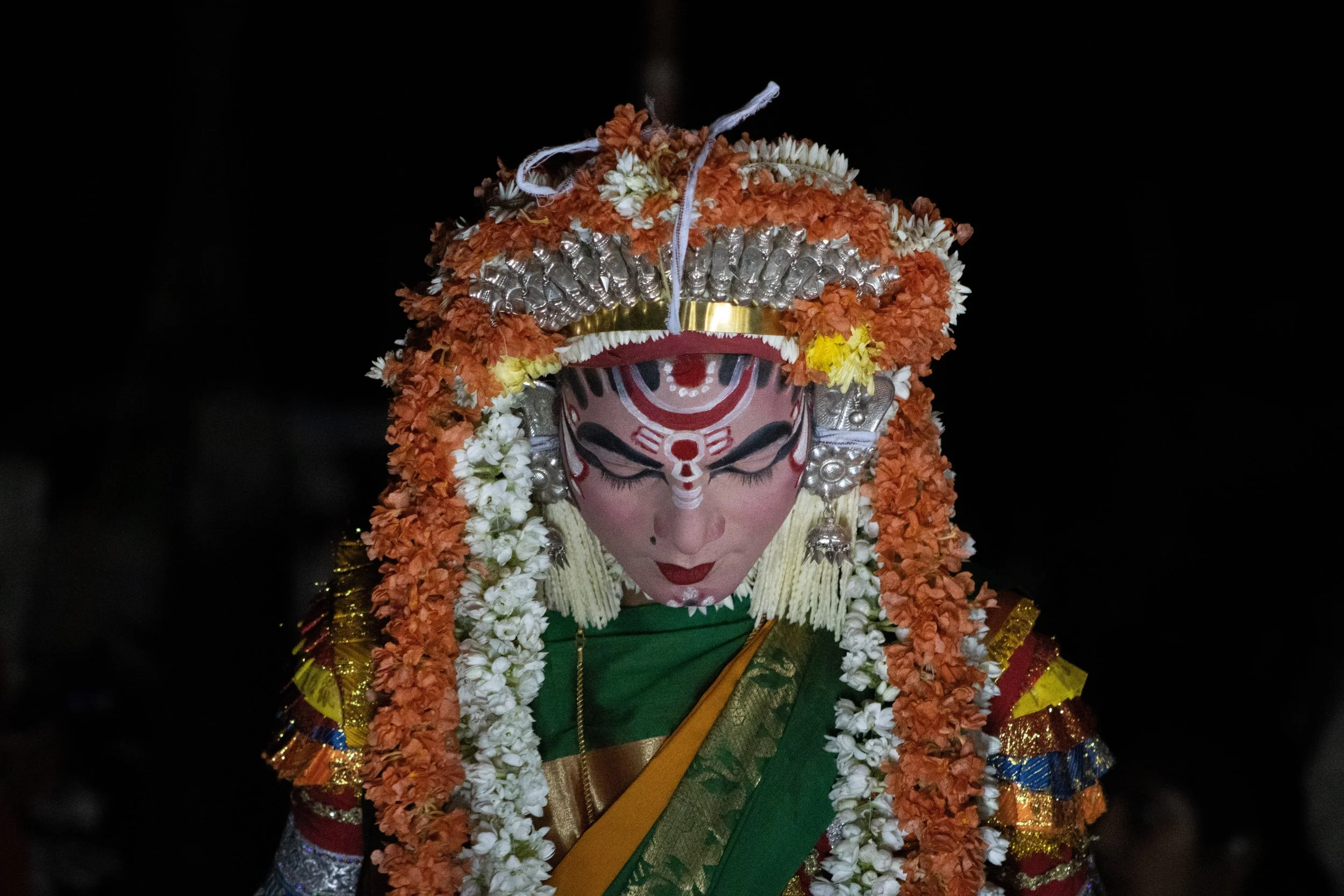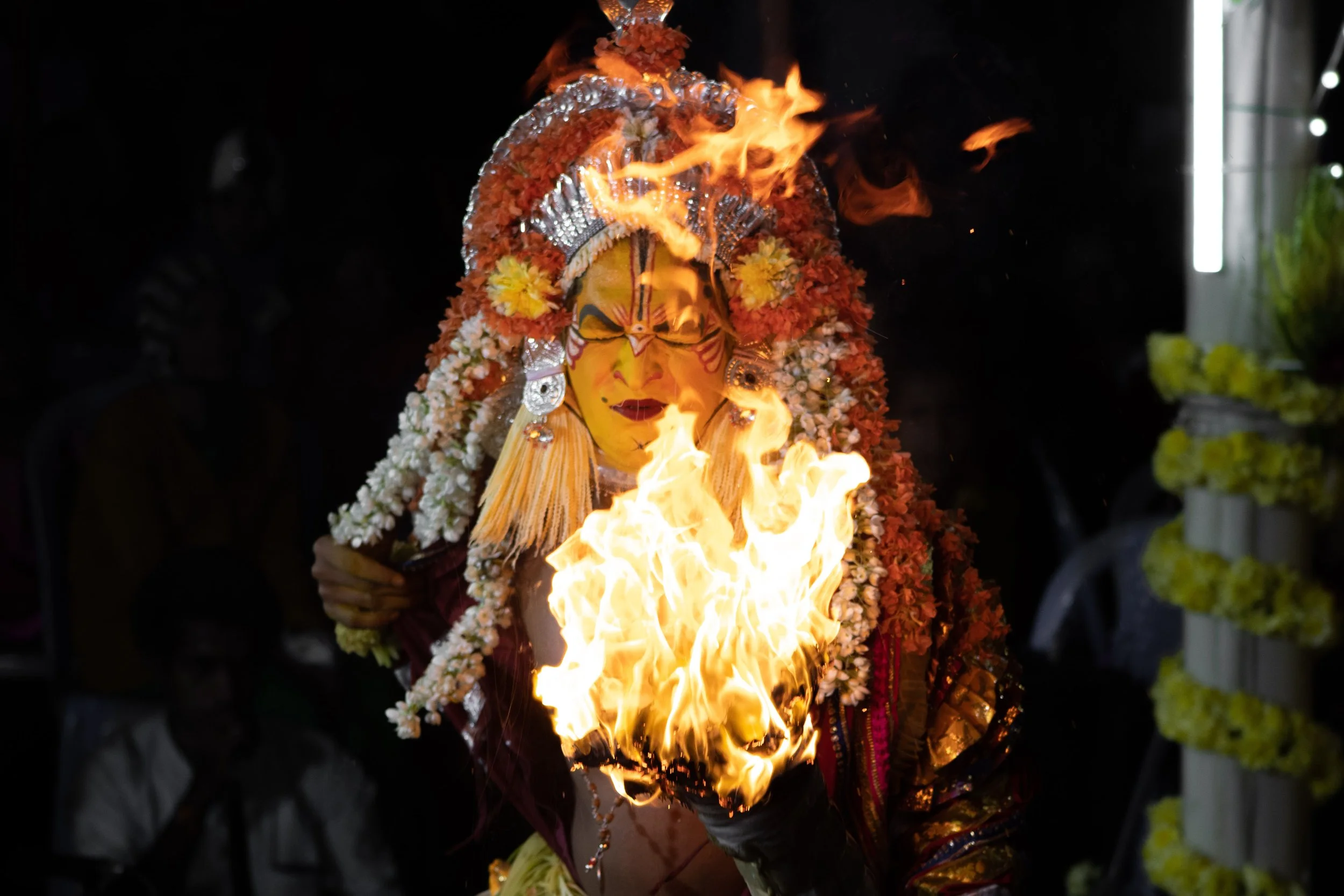 Būta Kōlā is a traditional folk festival that is celebrated in various parts of Karnataka, particularly in the coastal regions. It is a form of spirit worship that involves the invocation of local deities or spirits through dance, music, and rituals. The festival is typically performed by members of the local communities, who believe that it helps to ward off evil spirits and bring good fortune. During the festival, performers wear elaborate costumes and masks, often made of natural materials like wood and leaves, and perform intricate dance movements to the beat of drums and other musical instruments. Bhoot Kola is a vibrant and colorful celebration of Karnataka's rich cultural heritage, and it attracts visitors from all over the region to witness the spectacle of this unique festival.
